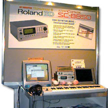 The first big thing we saw at NAMM's Technology Central area was a little old iMac sporting the new Roland SC-8850 SoundCanvas. I don't mean hooked up for illustrative purposes as to how it will be. The new multi platform, multi interface, multi voice MIDI sound module was fully erect, if you will, and functioning as a good Mac peripheral should. The SC-8850 packs 1640 sounds, 128 voices, 64 parts, 63 Drum sets, 64 Insert effects and best of all, a choice of MIDI, Mac Serial, PC Serial or USB! That's right, this new SoundCanvas is the first MIDI sound module with a built on USB port. The MIDI section offers two input and two output ports and is very convenient for those who have a couple of keyboard controllers or plan to add another controller in the future, but do not wish to add a MIDI patchbay to their system. Roland product representatives told us the SC-8850 will also work on Apple's blue & white G3 machines. I pressed the reps for insight on the now infamous UA-100 USB audio device and it's path to iMac. Yawn. All they heard was the product name, not my question. I was rushed to the other side of the MIDI display where a charming peecee of unknown manufacture was happily running the UA-100. After nodding through the reps anxious attempt to get me excited about the product, I restated my question about that product and iMac. The rep, of course, told me (with eyes lowered, humbly) that Apple doesn't support audio on iMac. All right. Another rep jumped in as I was about to kindly update representative A's misinformation. Rep B chimed in with "We're waiting for drivers from Apple." We know that, I just wanted someone to say it out loud. Fear not, there is news near to breaking about iMac drivers for MIDI & Audio. We can't tell you what we know until it's confirmed. Let's just say the project is in more than capable hands, and you won't be disappointed when everything comes together.